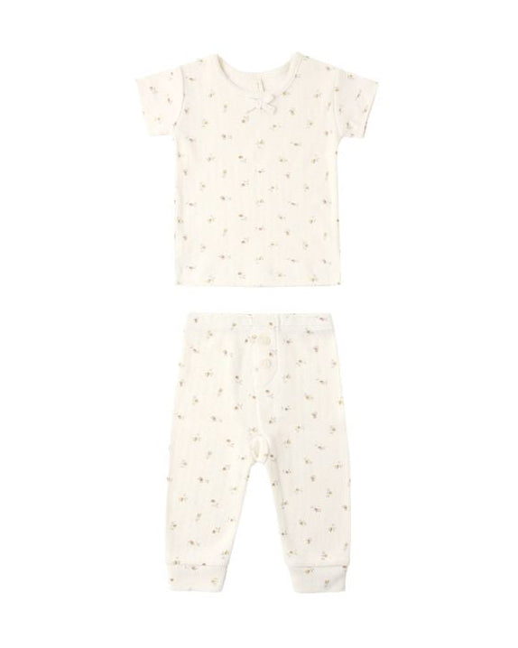 This sweet pointelle set features a short sleeve shirt and leggings with an elastic waistband and faux shell buttons at center front.