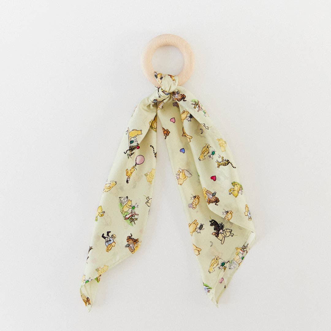 The Winnie the Pooh Baby Teether is a 3" diameter solid Maple wood ring with a 21" x 21" Mini Playsilk securely knotted onto it. Designed for little hands to grasp easily, it offers a comforting sensory experience through the combination of smooth wood and lightweight silk, with illustrated characters throughout the fabric.