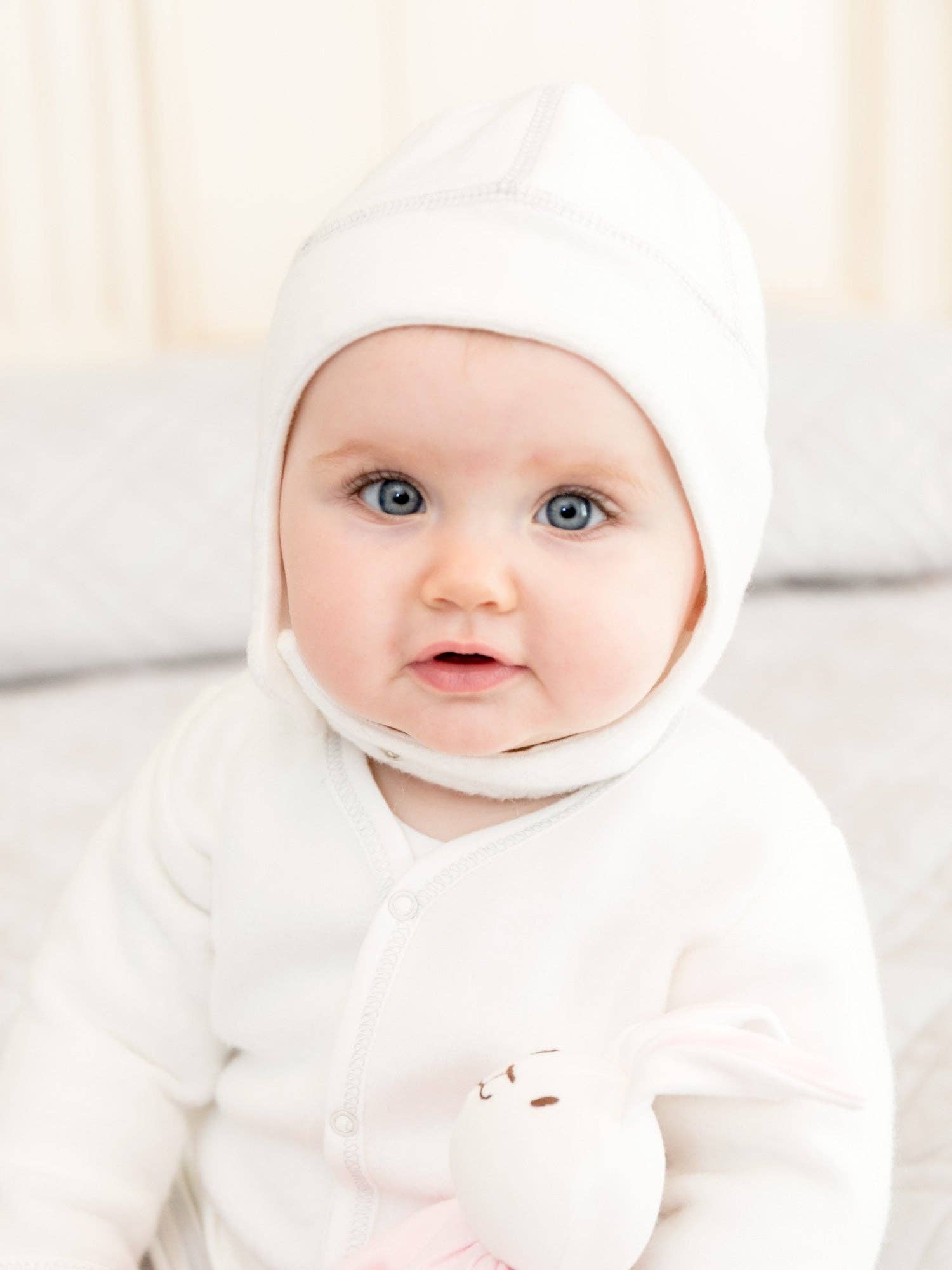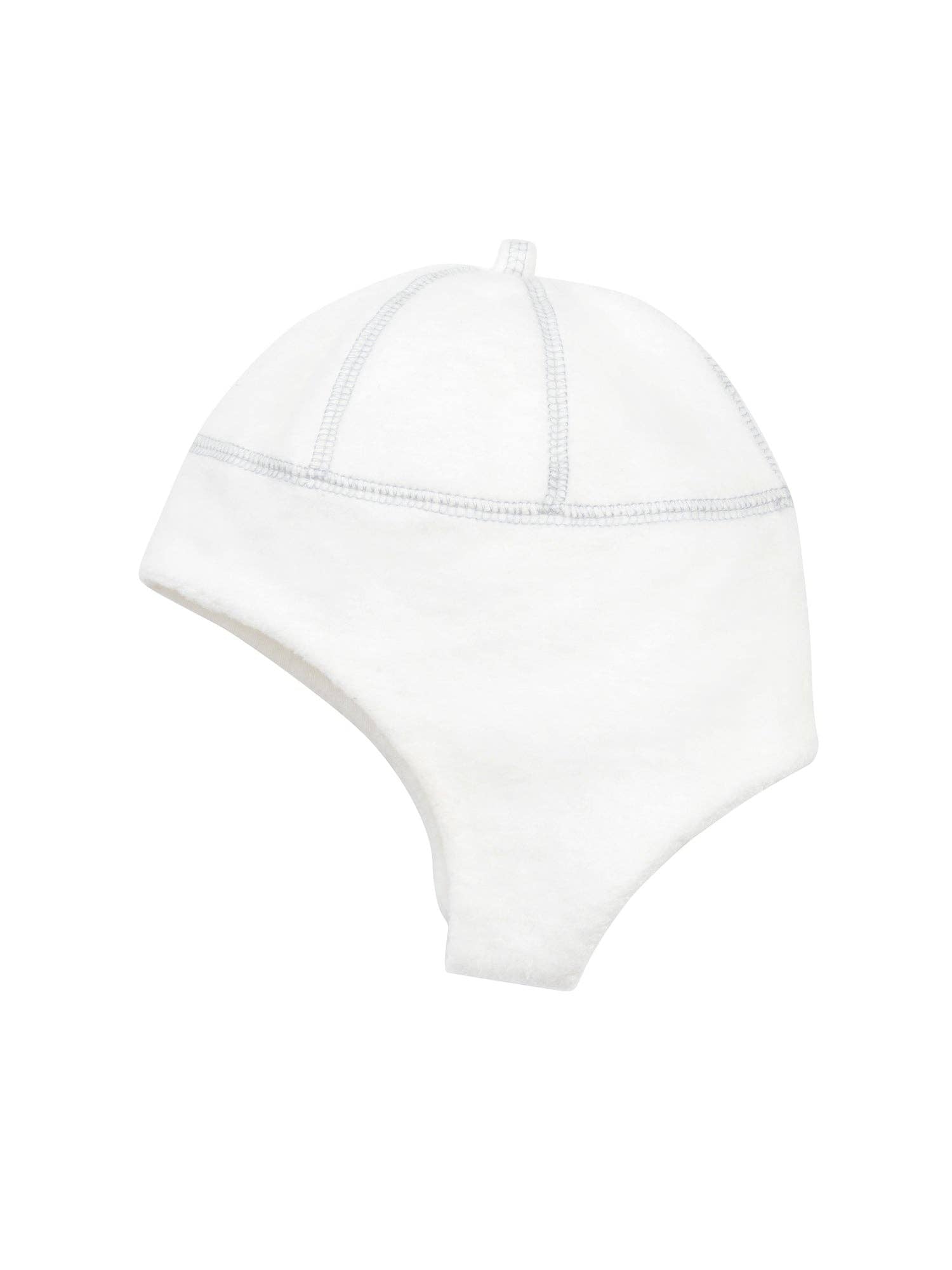 This organic brushed sherpa ear flap hat is a must-have for the chilly season! This winter hat will keep your baby's head and ears nice and warm with snaps under the chin for extra security and snug fit. Coordinates with the rest of our Winter White Sherpa Collection.
