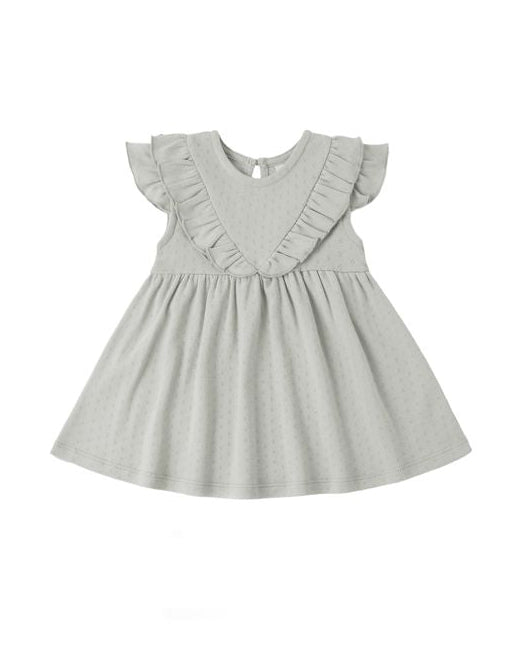 Flutter sleeve dress with sweet ruffle detail in our classic pointelle fabric. Button back closure for easy changing. Coordinating bloomers included with all sizes.